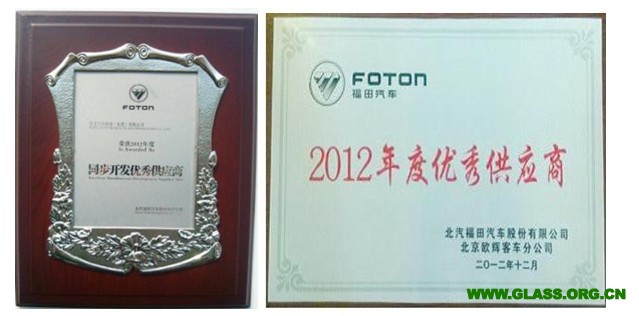 2012年12月28日,信義玻璃旗下的信義汽車玻璃(東莞)有限公司參加北汽福田汽車股份有限公司在北京九華山莊舉辦的供應商年會。會上,福田汽車集團公司授予信義玻璃2012年度“同步開發(fā)優(yōu)秀供應商”。與此同時,因信義玻璃為歐輝客車提供了優(yōu)良的產(chǎn)品及服務,被北汽福田旗下獨立品牌公司歐輝客車分公司授予“2012年度優(yōu)秀供應商”。