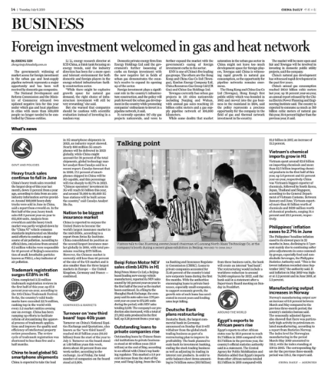 2019年7月9日的CHINA DAILY報(bào)紙上刊登了北玻股份董事長(zhǎng)高學(xué)明先生在中國(guó)玻璃展上與北美最大的玻璃集團(tuán)Vitro的集團(tuán)高管交流的照片。