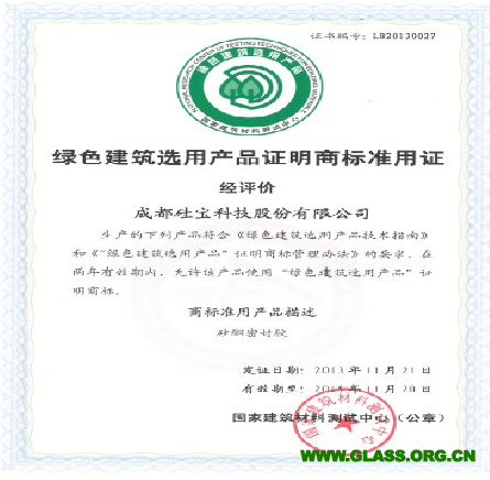 經公司多方努力,硅寶硅酮密封膠產品于2013年11月21日獲得國家建筑材料測試中心(CTC)的綠色商標使用證明認證。硅寶是行業內第一家通過CTC綠色認證的公司,目前也是唯一一家,認證信息查詢網址:http://www.ctc-tj.com/qiye.html。