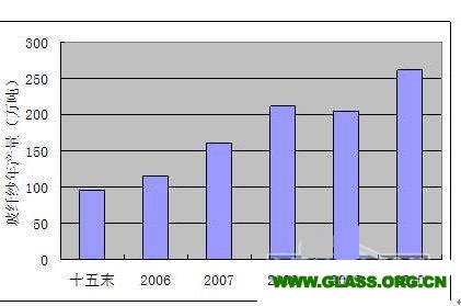 全國玻璃行業在“十一五”期間受我國的房地產建設情況而波動。2005年全國平板玻璃產量為4.02億重量箱,至2010年全國平板玻璃產量達6.3億重量箱,同比增長10.9%,效益更是創歷史最好年份,全年銷售收入預計為690億元,同比增長32.8%,利潤超73億元,同比增長13%。平板玻璃產量“十一五”平均年增長11.2%,整個“十一五”產量增長了56%。(見圖4)