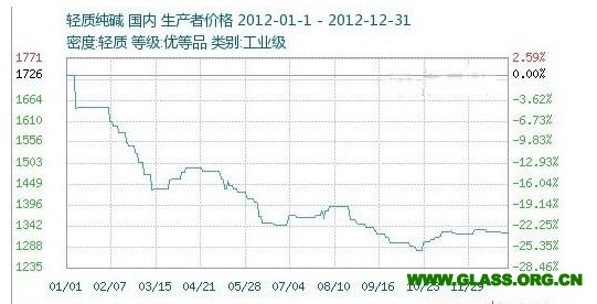 2012年國內純堿市場呈現下跌趨勢,據生意社監測的數據顯示輕質純堿年初主流均價為1726元/噸,年末主流均價為1316元/噸,下跌幅度為23.78%。從下圖可以看出輕質純價格處于單邊下跌的狀態,期間雖有小幅回調,但始終難擺下跌的行情。國內重質純堿全年亦呈現下跌趨勢,年初主流均價為1875元/噸,年末主流均價為1355元/噸,下跌幅度為27.73%。