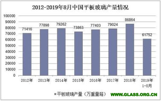 近年來我國平板玻璃產量逐年提升,2018年中國平板玻璃產量達86864萬重量箱,同比增長9.9%,平板玻璃行業對純堿的需求量達1303萬噸,2019年1-8月平板玻璃產量達61752萬重量箱,同比增長5.2%。