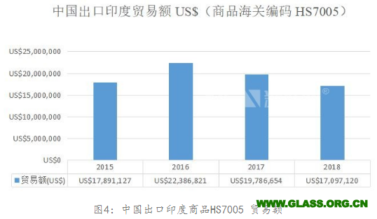 經(jīng)查詢商品海關編碼,將中國出口至印度的商品HS7003(鑄制或軋制玻璃板、片或型材或異型材,未經(jīng)其他加工)、HS7004(拉制或吹制玻璃板、片,未經(jīng)其他加工)、HS7005(浮法玻璃板片及表面研磨或拋光玻璃板片,未經(jīng)其他加工)、HS7006(經(jīng)彎曲、磨邊、鏤刻、鉆孔、涂琺瑯或其他加工的編號7003/7004/7005)、HS7007(鋼化及層壓玻璃制安全玻璃)、HS7008(多層隔溫、隔音玻璃等組件)的2015年-2018年貿(mào)易額進行統(tǒng)計。