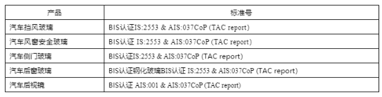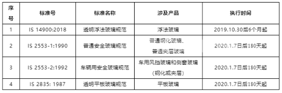 2019年,印度商業(yè)和工業(yè)部連續(xù)頒發(fā)了《平板玻璃質量控制令,2019》《浮法玻璃質量控制令,2019》以及《安全玻璃質量控制令,2019》并于2019年10月30日與2020年1月7日正式發(fā)布通報,決定對玻璃產(chǎn)品實施強制的ISI標識認證,將浮法玻璃、平板玻璃及安全玻璃納入強制性認證清單。涉及玻璃產(chǎn)品、標準及執(zhí)行日期如下: