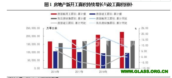 2019年我國房地產(chǎn)開發(fā)投資完成額13.22萬億元,同比增長9.9%;同期房地產(chǎn)新開工面積同比增長8.5%,增速下降8.7個百分點;自2017年底以來房地產(chǎn)新開工的高增速與竣工的增速出現(xiàn)了一定程度的背離,前累積了較多的竣工交付壓力,2019年下半年逐漸回補,全年竣工面積同比增長2.6%。受益于下游市場發(fā)展,2019年我國玻璃市場需求有所提升,以平板玻璃為例,2019年實現(xiàn)銷量8.95億重量箱,同比增長9.44%。作為幕墻使用的玻璃一般在主體結(jié)構(gòu)施工結(jié)束之前進場,而裝修裝飾用的玻璃則在主體結(jié)構(gòu)施工結(jié)束后進場,因此前期投資額及新開工面積增長預計仍能夠?qū)?020年玻璃需求提升起到一定程度支撐。