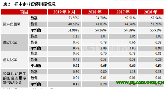 樣本企業(yè)短期債務壓力加大,業(yè)內(nèi)企業(yè)財務風險或有所提升。下游行業(yè)景氣度下降以及占款增加等因素推動2019年以來玻璃制造企業(yè)債務融資規(guī)模加大,部分樣本企業(yè)短期償債能力指標表現(xiàn)有所下降,鑒于2020年行業(yè)盈利預期回落以及下游行業(yè)資金面偏緊且壞賬風險增加等因素,預計業(yè)內(nèi)企業(yè)財務風險或?qū)⒂兴嵘?/p>