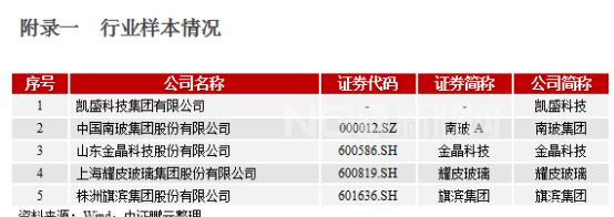 中證鵬元通過篩選主要在境內(nèi)經(jīng)營的公開市場發(fā)行過債券和上市的玻璃制造企業(yè),并剔除從事特定玻璃制品生產(chǎn)(如玻璃瓶等)企業(yè)和在短期內(nèi)發(fā)生重大資產(chǎn)重組的企業(yè)后,得到6家樣本企業(yè),另金剛玻璃因被證監(jiān)會立案調(diào)查且2018年財務報告被出具“無法表示意見”的審計報告將其剔除后,剩余樣本企業(yè)5家,具體見附錄一。