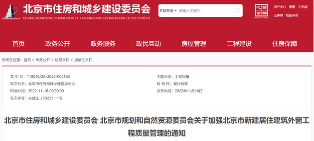 北京市住房和城鄉(xiāng)建設(shè)委員會 北京市規(guī)劃和自然資源委員會關(guān)于加強北京市新建居住建筑外窗工程質(zhì)量管理的通知