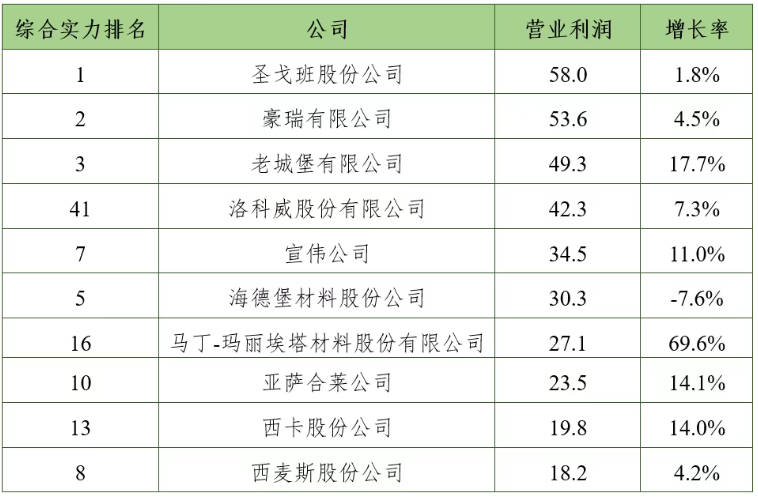 營業(yè)利潤超過20億美元公司共8家,均來自歐洲和北美洲。圣戈班股份公司(法國)以58.0億美元營業(yè)利潤繼續(xù)位居第一,豪瑞有限公司(瑞士)和老城堡有限公司(愛爾蘭)分列第二和第三。馬丁瑪麗埃塔公司營業(yè)利潤大幅增長,主要原因是出貨量回升和運(yùn)營水平提高。