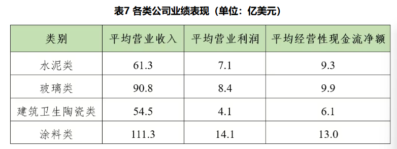 水泥類和玻璃類公司平均營業(yè)利潤基本與上一年度持平。建筑衛(wèi)生陶瓷類公司各項(xiàng)指標(biāo)均出現(xiàn)不同程度下滑。涂料類公司平均營業(yè)收入、平均營業(yè)利潤表現(xiàn)良好。各類公司平均經(jīng)營性現(xiàn)金流凈額均有不同幅度減少。