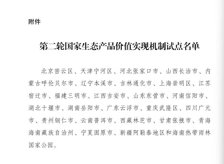 為深入貫徹黨的二十大和二十屆歷次全會精神,認真落實黨中央、國務院決策部署,加快推進中共中央辦公廳、國務院辦公廳《關于建立健全生態產品價值實現機制的意見》重點任務落實,經部門推薦、征求地方意見等程序,確定北京市密云區等25個地區和海南熱帶雨林國家公園為第二輪國家生態產品價值實現機制試點,試點期限為2026-2028年。現將第二輪試點名單予以公布,并就有關事項通知如下: