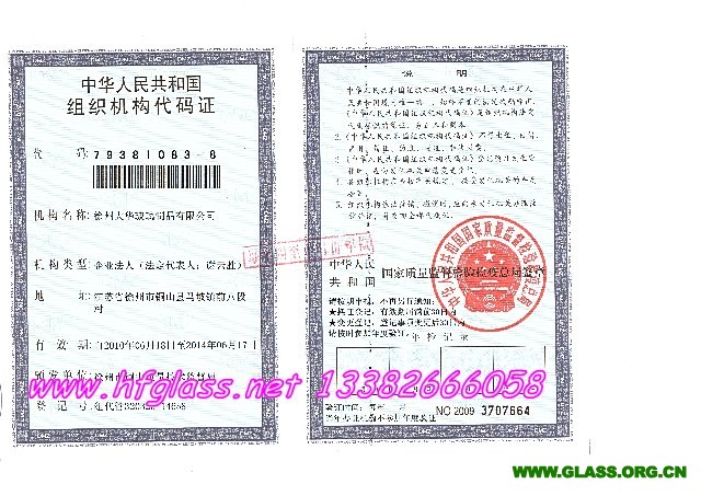證書(shū)介紹 徐州大華玻璃制品有限公司 組織代碼證 徐州大華玻璃制品有限公司(徐州大華玻璃瓶廠)www.hfglass.net是中國(guó)最大的玻璃瓶(廣口瓶)生產(chǎn)基地及出口基地,熱線0516-85382638工藝先進(jìn)技術(shù)力量雄厚,,能生產(chǎn)各種規(guī)格型號(hào)的玻璃瓶,玻璃制品,玻璃罐glassbottle glassjar 按國(guó)家輕工部及企業(yè)標(biāo)準(zhǔn)生產(chǎn)品質(zhì)保證!公司多次被評(píng)為“AAA級(jí)信用企業(yè)”、“全國(guó)大二型鄉(xiāng)鎮(zhèn)企業(yè)”、“重合同守信用企業(yè)”公司通過(guò)ISO9001質(zhì)量體系及SGS,FDA,以及歐盟LFGB認(rèn)證,產(chǎn)品出口至日本、美國(guó)、俄羅斯、加拿大、法國(guó),英國(guó),意大利,韓國(guó)、澳大利亞等40多個(gè)國(guó)家地區(qū),贏得國(guó)內(nèi)外客戶的青睞。公司產(chǎn)品主要有:玻璃瓶、玻璃罐,玻璃瓶子,酒瓶、洋酒瓶,香水瓶、醬菜瓶、罐頭瓶、飲料瓶、蜂蜜瓶、咖啡瓶、玻璃燭臺(tái),果酒瓶,保健酒瓶,葡萄酒瓶,威士忌酒瓶,果汁瓶,腐乳瓶,果醬瓶,醬醋瓶,麻油瓶,調(diào)味瓶,蜂蜜瓶,保健瓶,罐頭瓶,醫(yī)藥瓶,胡椒粉瓶,烤花瓶,蒙砂瓶,玻璃奶瓶,燕窩瓶,枇杷膏瓶,金銀花露瓶,菌苗組瓶,輸液瓶,農(nóng)藥瓶等90多個(gè)系列2000多個(gè)品種,并能為客戶來(lái)樣烤花、印字,蒙砂LOGO等深加工。公司擁有配套瓶蓋廠生產(chǎn)各種規(guī)格型號(hào)的馬口鐵瓶蓋及塑料瓶蓋,以及實(shí)力雄厚的模具生產(chǎn)公司,可以在最短的時(shí)間為客戶定制,訂做高品質(zhì)的模具。新產(chǎn)品開(kāi)發(fā)7-10天出產(chǎn)品, 公司擁有成熟的物流方式及進(jìn)出口權(quán),可為客戶代辦托運(yùn)、以及報(bào)關(guān)報(bào)檢業(yè)務(wù)。大華宗旨: 質(zhì)量第一、客戶第一、誠(chéng)信第一 .