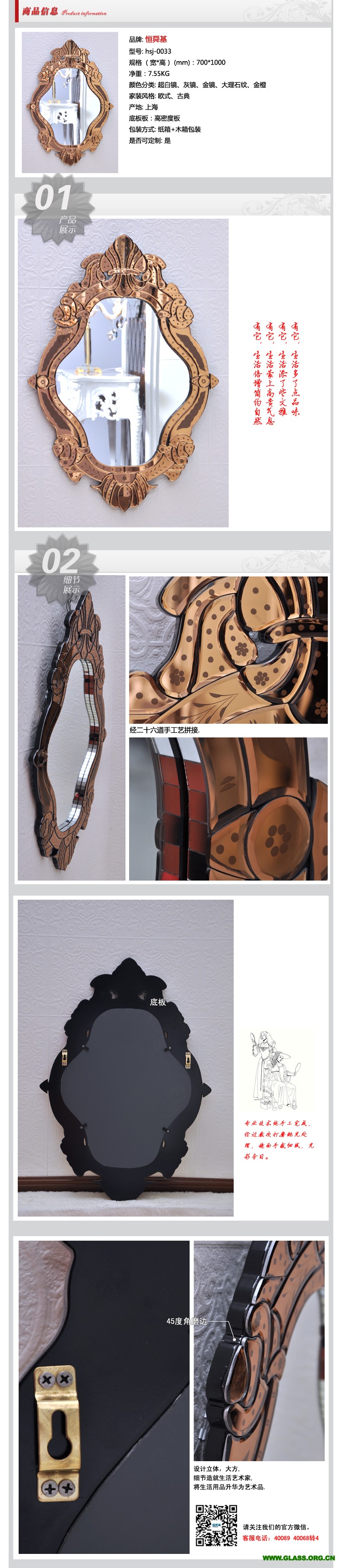 恒舜基”藝術玻璃主要產品有國內首創的閃光冰鉆玻璃系列,精彩鉆玻璃系列,曼殊.威尼斯鑲嵌彩繪玻璃、彩雕玻璃、水幕墻、玻璃雕塑等玻璃精品,意大利古典宮廷鏡為我司新產品,由意大利著名設計師Ferrucc jo Laviani設計,品種多樣,風格各異,每件產品純手工經二十六道工序制作完成。奢華的歐式古典鏡以玻璃材質勾勒復雜而華麗的歐式線條;色彩和圖案非常民族性,而且鏡框的設計也好似歐式宮廷感覺。