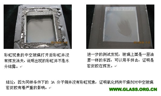 5. 此類干燥劑可以輕易破壞丁基膠,造成丁基膠揮發,在玻璃表面上形成彩虹現象。玻璃表面的彩虹在玻璃打開后可以用手抹掉,是丁基膠被酸類破壞后的揮發物。