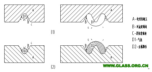 當玻璃液在電熔澆鑄的池底鋪面磚下面流動,或者當玻璃液穿過池底鋪面磚的垂直接縫與鋪面磚下面的耐火材料起反應時,就會產生氣泡[見圖1-(1)],這些氣泡會迅速向上侵蝕上面的電熔鋯剛玉。池底鋪面磚以下的耐火磚產生氣泡的趨勢是很重要的。如耐火磚產生氣泡的趨勢大,則向上侵蝕量也大。