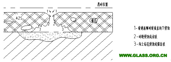 由氣泡所引起的最初的侵蝕點是在層間的水平縫中,如鋪面磚為單層時,則在鋪面磚和密封層之間的水平接縫中(見圖2)。垂直接縫中的侵蝕作用比水平接縫少一些。但由于玻璃液是通過垂直的接縫流到水平接縫里的,因此應使池底鋪面磚、接縫及密封層三個部位結合成密閉不可分割的整體,才能有效地防止玻璃液滲流到水平接縫里。