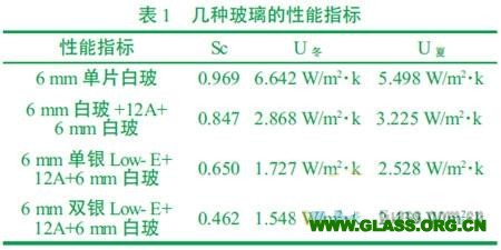 在玻璃的節能特性指標中,最主要的就是遮陽系數(Sc)和傳熱系數(U)這兩項性能參數。Sc 直接反映玻璃對太陽的遮蔽效果,它體現的是玻璃的隔熱性能。Sc 值高意味著透過玻璃進入室內的太陽輻射多,玻璃的隔熱性能差。U是反映玻璃的溫差傳熱特性,它體現的是玻璃的保溫性能。在相同的室內外溫差下,U 值低意味著玻璃因溫差傳熱而傳遞的熱能少,玻璃保溫性能好。以6 mm單片白玻、6 mm中空白玻、6 mm單銀Low- E中空白玻和6 mm雙銀Low- E中空白玻為例, 其Sc 和U 值見表1。