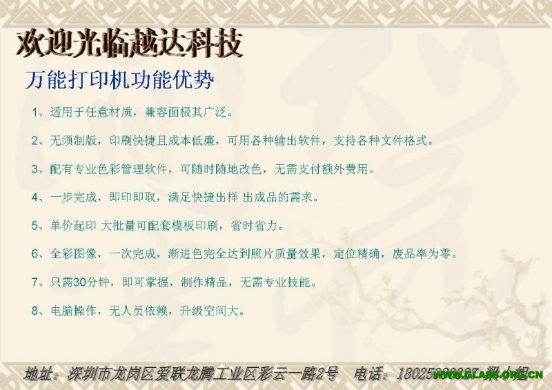 深圳市越達(dá)彩印科技有限公司,經(jīng)市場部歷時7個月的新疆考察行決定!我公司有必要把玻璃打印機(jī),平板噴繪機(jī)等平板彩印設(shè)備,推向新疆,因為新疆地大物博,旅游行業(yè)非常的發(fā)達(dá),那么我們所能做的就是用我公司精心研發(fā)的平板彩印設(shè)備,讓新疆的小型工藝品更具民族特色.讓所有到過新疆的朋友,把新疆的文化帶回家!